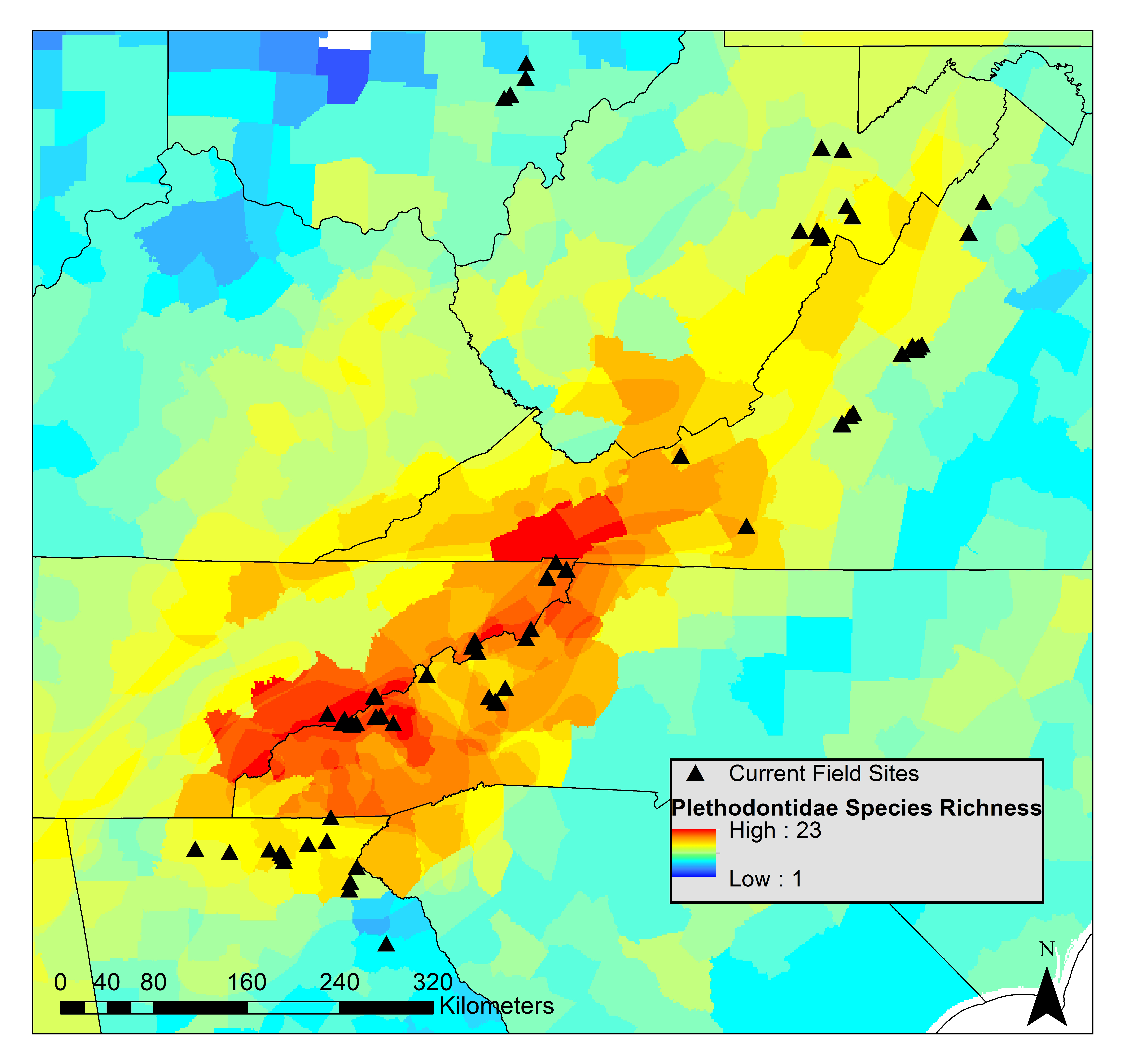 My dissertation work at Ohio University focused on the evolutionary ecology of Plethodontid salamanders. I was specifically investigating this topic from the perspective of microhabitat. I wanted to find out how microhabitat use differed between species, how these variables influence the distributions of plethodontid species, and if there were any evolutionary patterns in how species us microhabitats. I found differences in microhabitat use between wide-spread and range restricted species. My research also provided evidence that salamanders may be actively selecting microhabitats with preferential cool and moist microclimates. By actively selecting prefer conditions, this may limit the ability for species to evolve to changing climatic conditions. I also found evolutionary patterns in microhabitat use that highlights the importance of addressing questions at biologically relevant spatial and temporal scales. Overall, the results of my dissertation work served as a backbone for my continuing research described above.